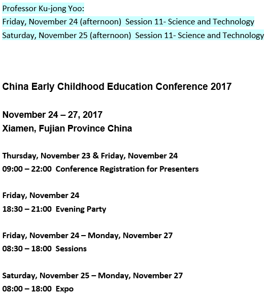 중국 최대의 유아교육 학술회의인 [중국유아교육연회(China Early Childhood Education Conference 2017)]에서의 유구종 회장 초정강연 일정입니다.