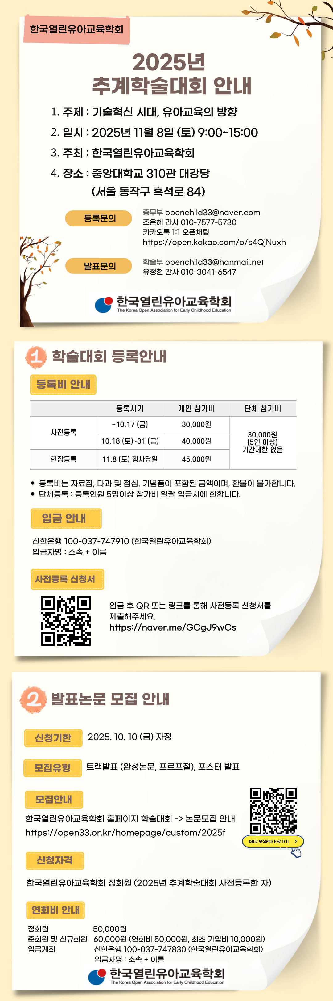 2025년 추계학술대회가 “기술혁신 시대, 유아교육의 방향”이라는 주제로 개최됩니다.
