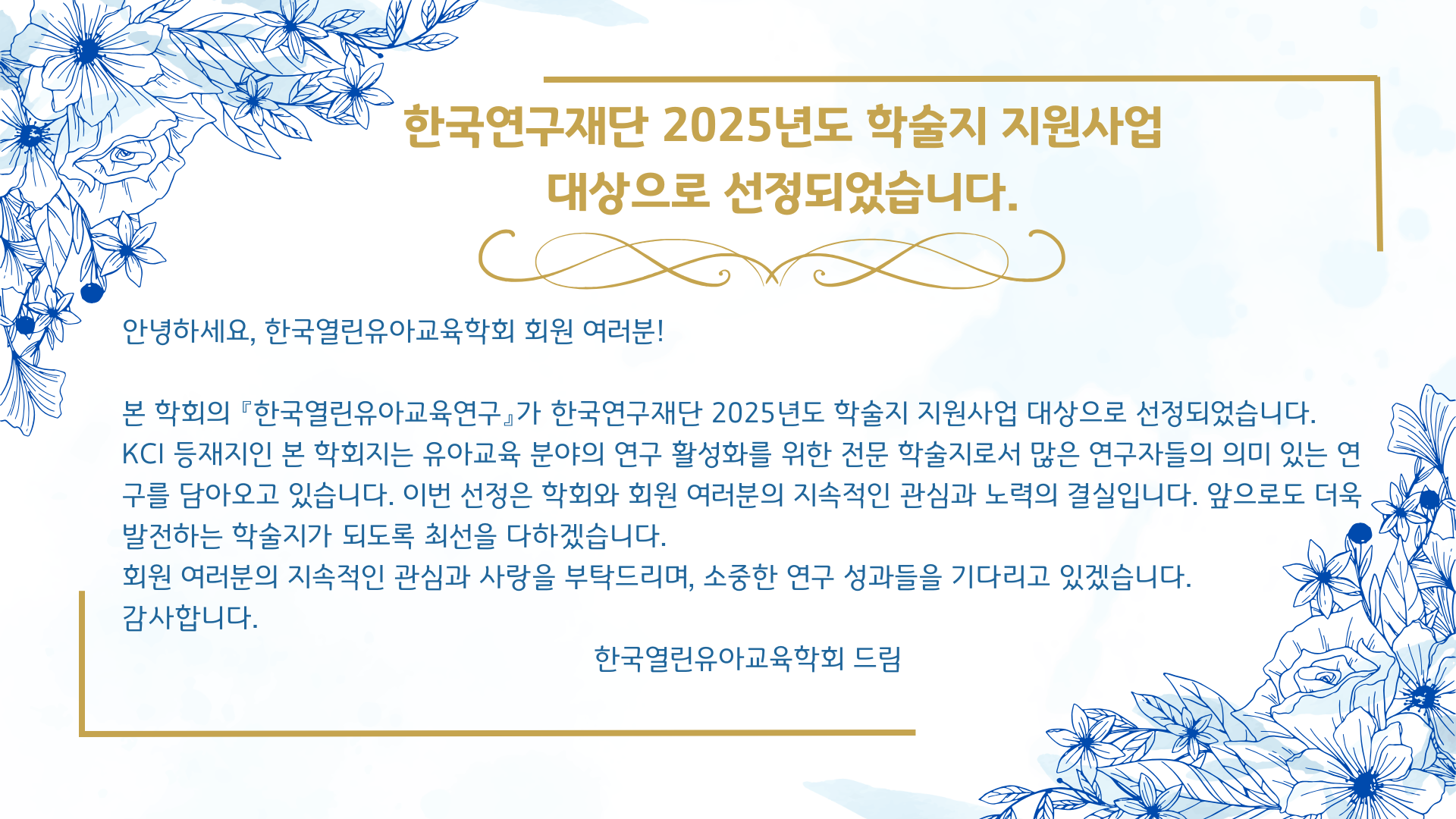 본 학회의 학술지 『열린유아교육연구』가 한국연구재단 2025년도 학술지 지원사업 대상으로 선정되었습니다.
