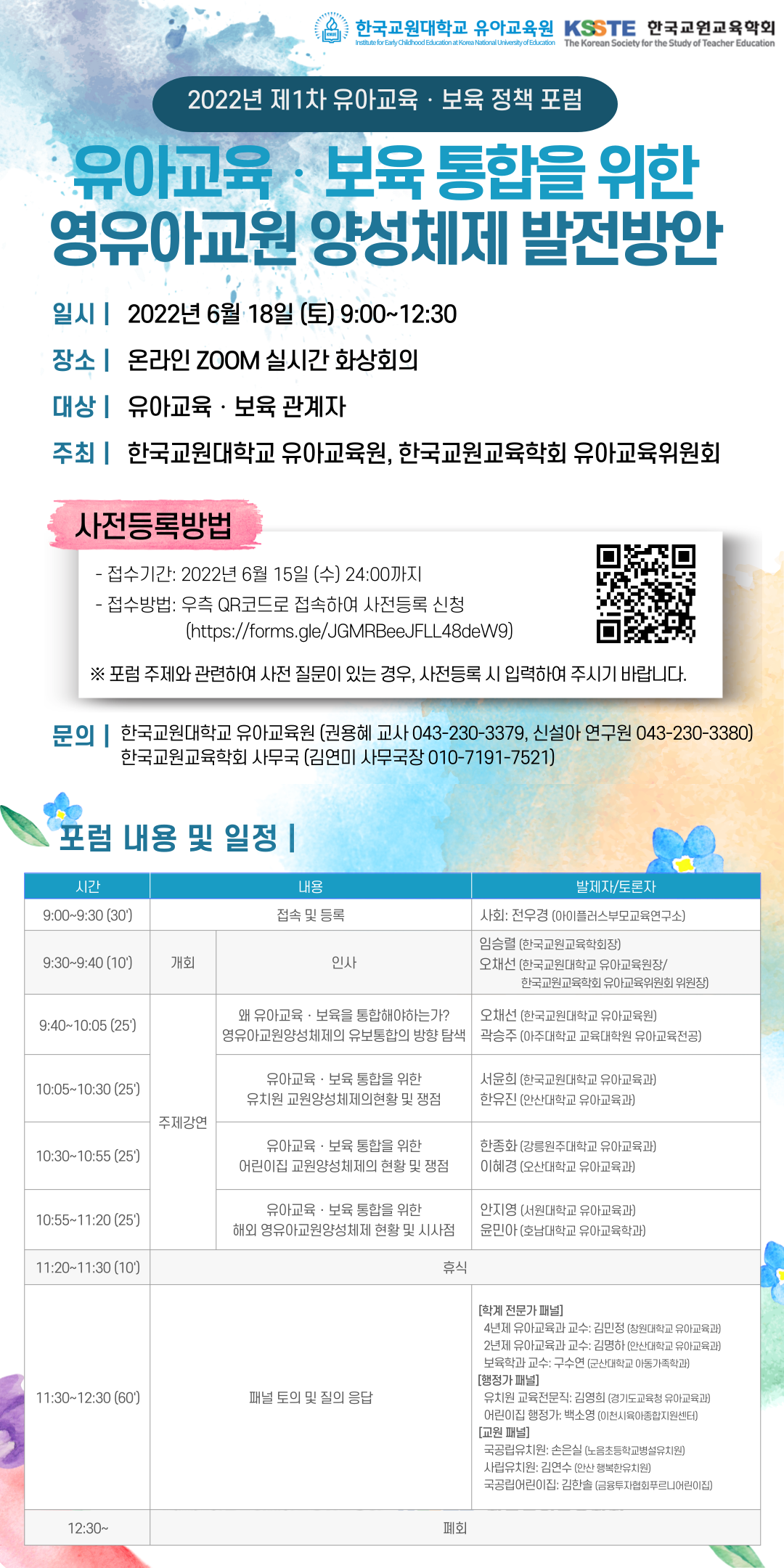 유아교육‧보육통합을 위한 영유아교원 양성체제 발전방안을 주제로 <2022년 제1차 유아교육‧보육 정책 포럼>을 준비하고 있습니다.